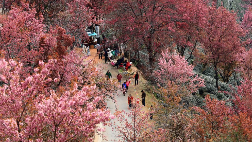 中 윈난 우량산, 분홍빛 겨울 벚꽃과 차밭이 어우러진 아름다운 풍경