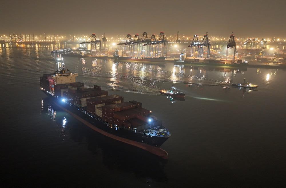 이날 드론으로 포착한 톈진항 부두에 입항하는 바흐호. 2024.1.17