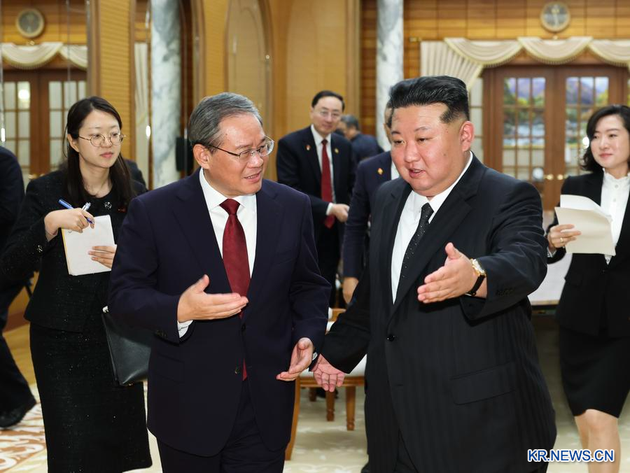 김 총서기는 리 총리에게 시 총서기에 대한 진심 어린 안부와 축원을 전해달라고 요청하고 이번 축하 행사 참석을 위한 중국 당정 대표단의 방문을 열렬히 환영하며 다음과 같이 밝혔다. 시 총서기의 현명한 지도 아래 중국 사회주의 건설은 거대한 성과를 이뤘다. 양국 관계는 깨뜨릴 수 없이 견고하다. 국제 정세가 어떻게 변하든 양국의 우호 협력 관계를 견고히 하고 발전시키는 것은 우리 당과 정부의 확고부동한 입장이며, 이는 양측의 공동 이익에 부합하고 지역의 평화·안정·발전에도 이롭다. 우리 측은 하나의 중국 원칙을 굳게 지지하고 '타이완 독립' 분열 행위와 어떠한 외부 간섭에도 단호히 반대하며 홍콩·신장(新疆)·시짱(西藏) 문제에서 중국 측 입장을 지지한다. 우리 측은 중국 측과 고위급 교류를 긴밀히 하고 각 분야 협력을 촉진하며 다자 협력을 강화하고 각자의 사회주의 사업 발전을 추진해 두 나라 인민에게 더 많은 혜택이 돌아가도록 하고자 한다.