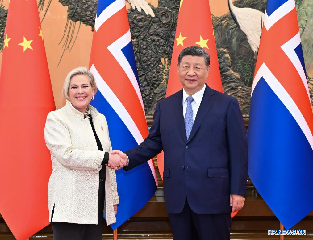 시진핑(習近平) 중국 국가주석이 14일 오전 베이징 인민대회당에서 글로벌 여성 서밋 참석차 중국을 방문한 할라 토마스도티르 아이슬란드 대통령과 회견했다.[촬영/신화사 기자 선훙(申宏)]