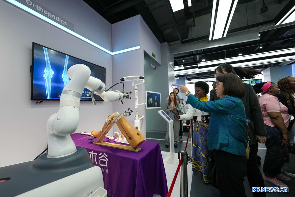 [신화망 베이징 10월15일] 14일 베이징 경제기술개발구의 로봇대세계에서 '글로벌 여성 서밋' 참석 귀빈이 인공지능(AI) 정형외과 수술 로봇에 대해 알아보고 있다.