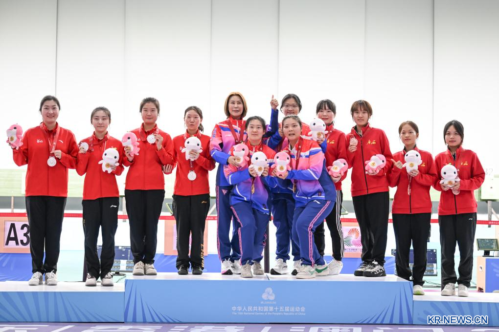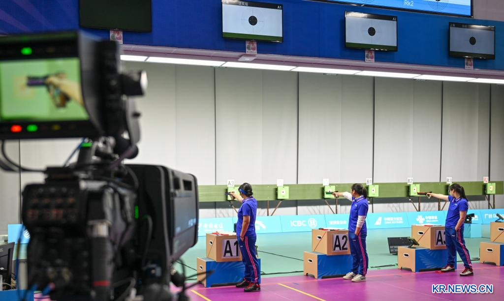 17일 경기 중인 상하이팀. 제15회 전국운동회 사격 여자 10m 공기권총 단체 결승전이 17일 광둥(廣東)성 광저우(廣州)시에서 열렸다.[촬영/신화사 기자 딩레이(丁磊)]