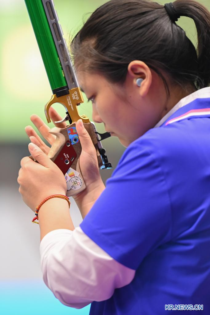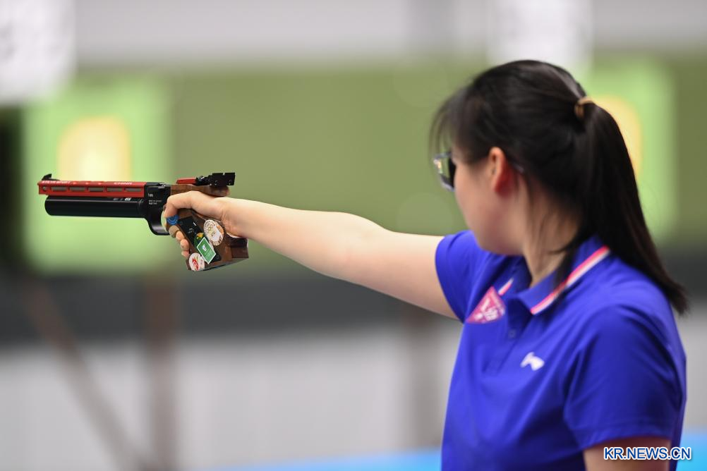 17일 경기 중인 상하이팀 선수 장치(張綺).제15회 전국운동회 사격 여자 10m 공기권총 단체 결승전이 17일 광둥(廣東)성 광저우(廣州)시에서 열렸다.[촬영/신화사 기자 딩레이(丁磊)]