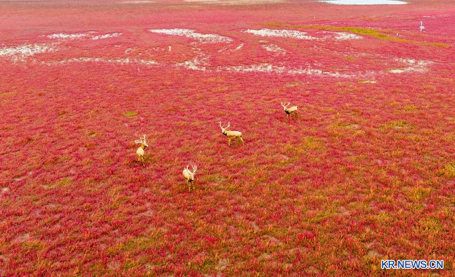 장쑤(江蘇)성 둥타이(東台)시 탸오쯔니(條子泥) 습지에서 사슴들이 노닐고 있다. (사진/신화통신)가을이 숲과 호수, 도시와 산에 스며들면