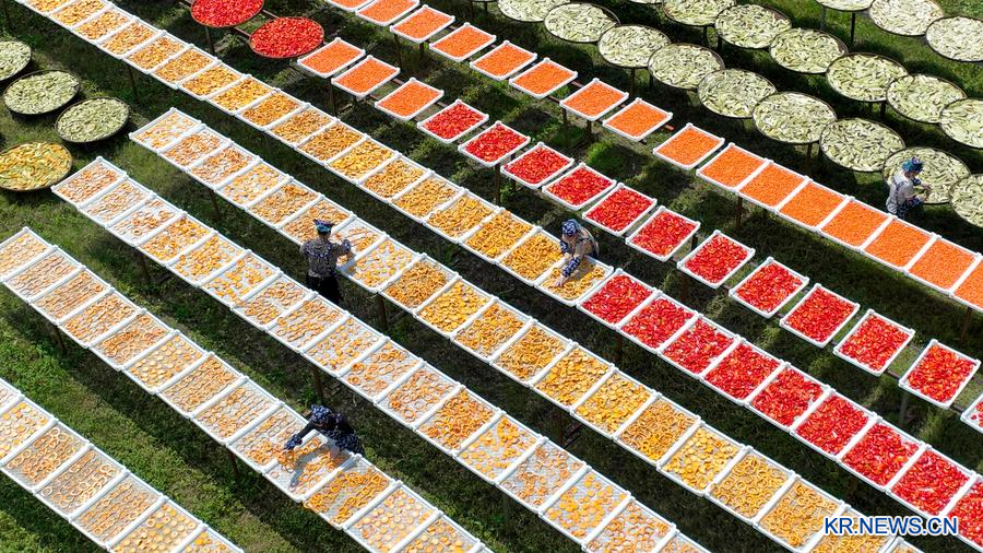 장시(江西)성 이춘(宜春)시 퉁구(銅鼓)현에서 마을 주민들이 수확한 농작물을 가을 햇볕에 말리고 있다. (사진/신화통신)