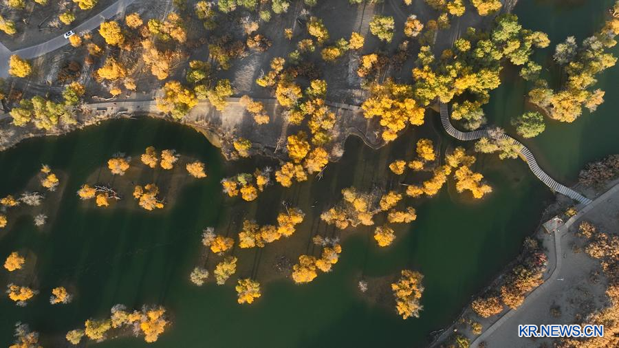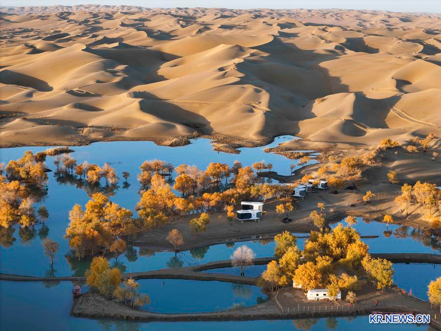 네이멍구(內蒙古)자치구 아라산(阿拉善)맹 어지나(額濟納旗)기에 위치한 후양린(胡楊林) 관광지. (사진/신화통신)가을이 초원을 물들이자
