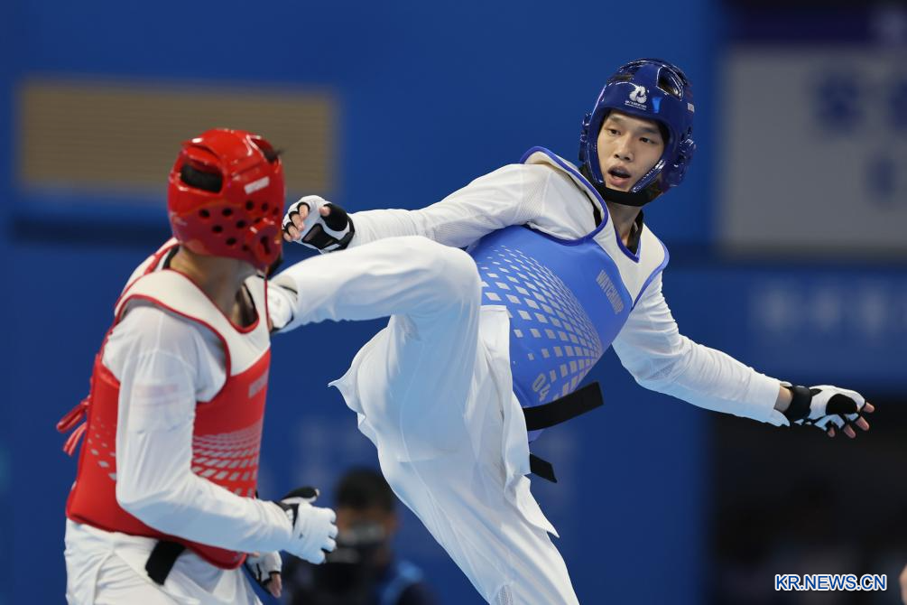28일 경기 중인 샹치장(오른쪽)과 탕하오. 샹치장(푸젠)이 28일 산둥성 후이저우에서 열린 제15회 전국운동회 태권도 남자 80kg급 결승에서 탕하오(베이징체육대학)를 꺾고 우승을 차지했다.[촬영/신화사 기자 루한신(盧漢欣)]