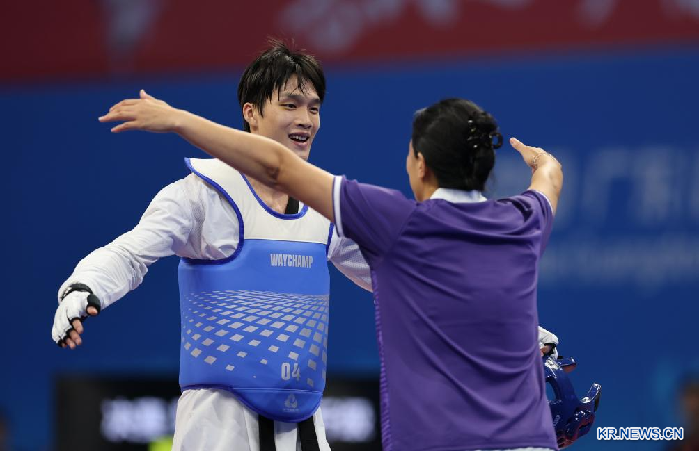 [신화망 베이징 9월29일] 28일 샹치장(왼쪽)이 우승한 후 허루민 코치와 함께 축하하고 있다. 샹치장(푸젠)이 28일 산둥성 후이저우에서 열린 제15회 전국운동회 태권도 남자 80kg급 결승에서 탕하오(베이징체육대학)를 꺾고 우승을 차지했다.[촬영/신화사 기자 루한신(盧漢欣)]