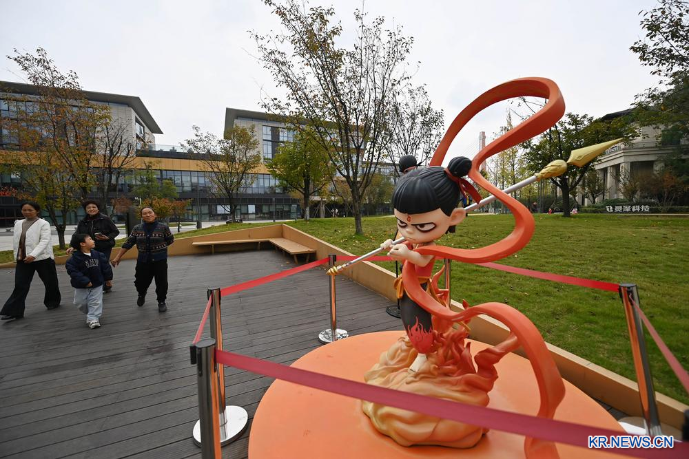 지난 2일 청두시 톈푸창다오(天府長島) 디지털 문화창의단지에서 사람들이 '너자(哪吒)' 조형물 앞을 지나고 있다. 2025.11.3