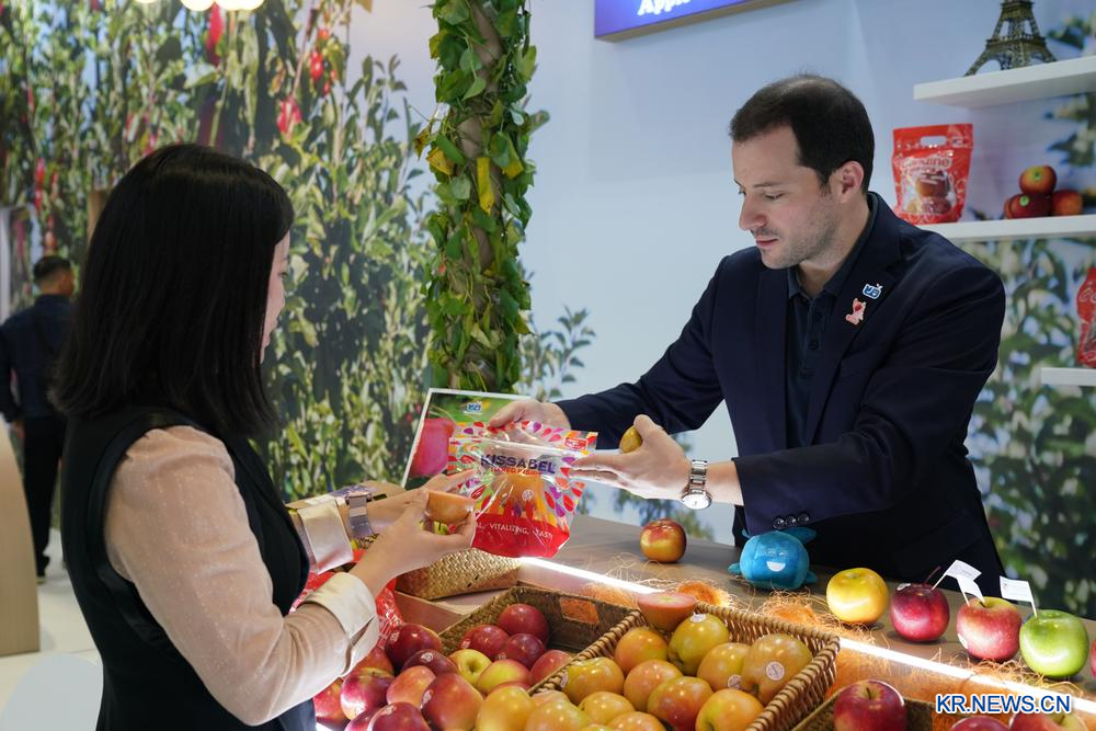 [신화망 상하이 11월8일] 7일 '제8회 중국국제수입박람회(CIIE)' 식품·농산물 전시구역에서 한 전시업체 직원(오른쪽)이 관람객에게 프랑스산 사과를 소개하고 있다.