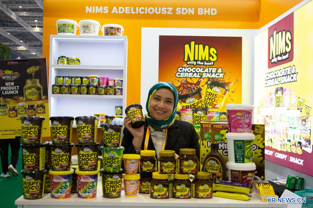 7일 식품·농산물 전시구역에서 말레이시아 대외무역발전국의 한 전시부스 직원이 초콜릿 제품을 들어 보여주고 있다. 2025.11.7