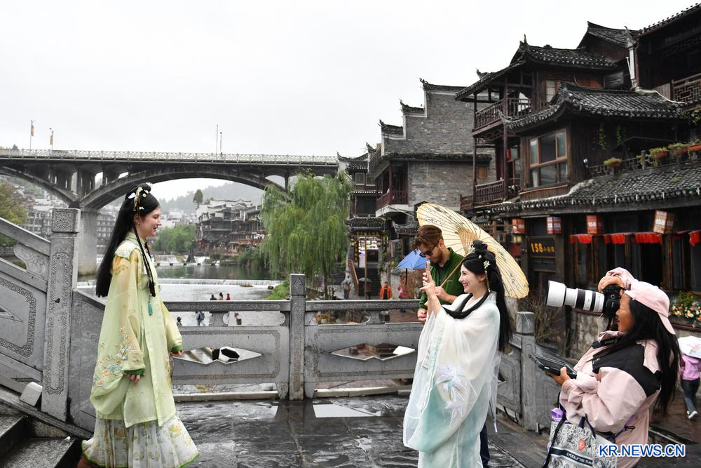 [신화망 샹시 11월9일] 옛 건축물과 특색 가옥이 보존된 후난(湖南)성 샹시(湘西)투자(土家)족먀오(苗)족자치주의 펑황(鳳凰)고성은 최근 수년간 관광 시장을 규범화하고 스냅 사진 등 관광 서비스 산업을 발전시켜왔다. 이에 최근 들어 현지 민족 의복을 입고 강가를 거니는 관광객들이 늘고 있다.