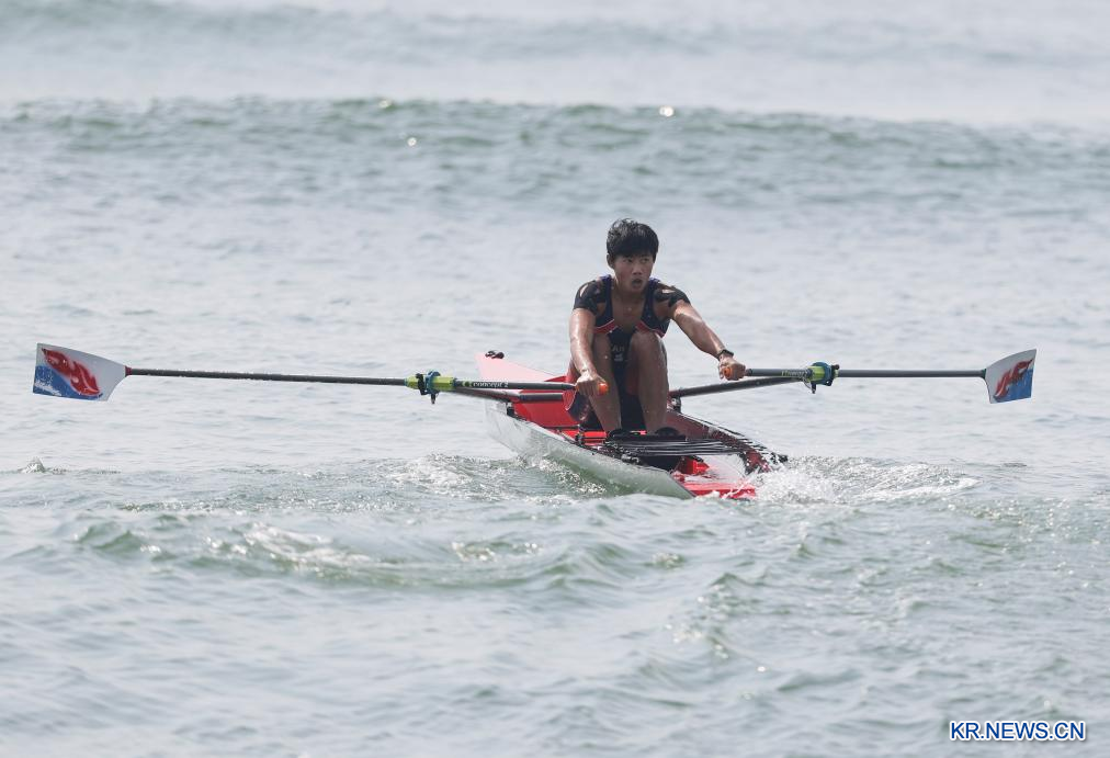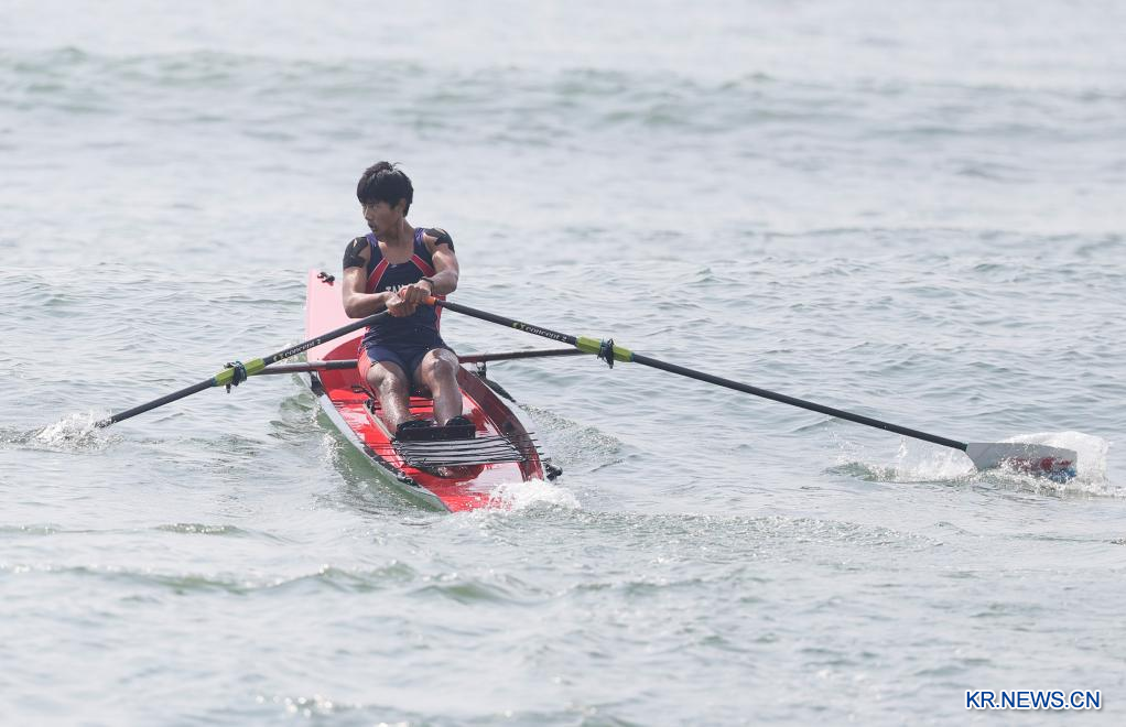 15일 광둥성 양장시에서 열린 제15회 전국운동회 비치조정 남자 싱글스컬 결승 A에서 탄루카이(푸젠팀)가 룽전타오(쓰촨팀)를 꺾고 금메달을 땄다. [촬영/신화사 기자 리란(李然)]