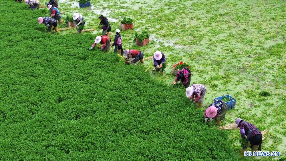 18일 허베이성 탕산시 훙차오진의 농민이 밭에서 고수를 수확하고 있다.