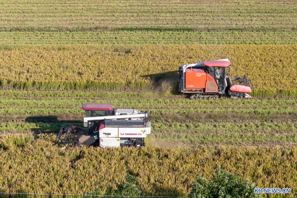 19일 저장성 위야오시 황자부(黄家埠)진 한샤(韓夏)촌에서 농기계로 늦벼를 수확하고 있는 농민.