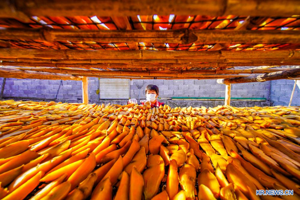 19일 허베이성 쭌화시 신뎬쯔(新店子)진의 농민이 마당에서 고구마를 말리고 있다.
