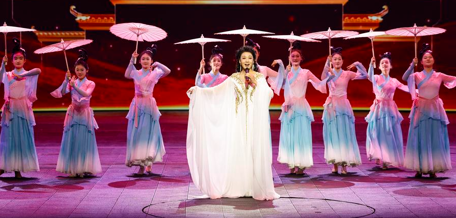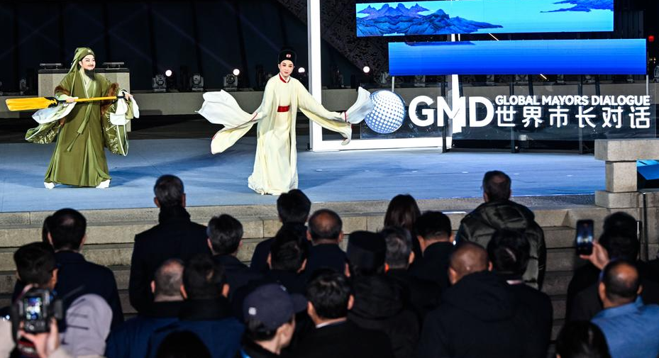 19일 '세계 시장(市長) 대화·난징(南京)' 행사 개막식에서 월극(越劇·저장성 전통희극) 배우들이 공연을 펼치고 있다.