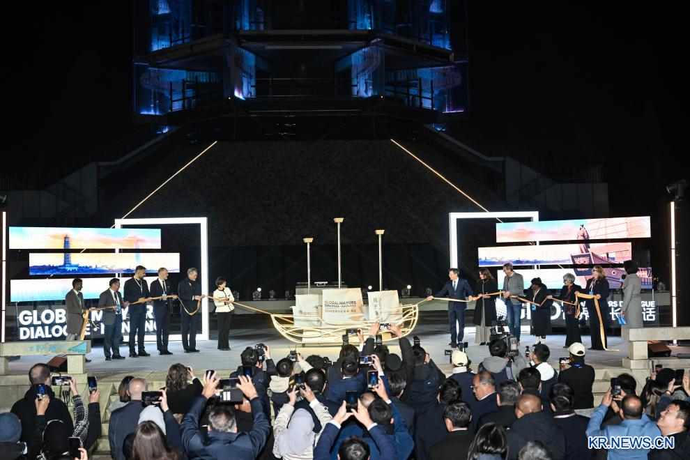 '세계 시장(市長) 대화·난징(南京)' 행사가 19일 장쑤(江蘇)성 난징에서 열렸다. 행사에는 브루나이·이집트·독일·이탈리아·중국 등 10개국 도시의 시장과 대표들이 참석했다.행사 개막 장치를 함께 가동하고 있는 국내외 귀빈들.