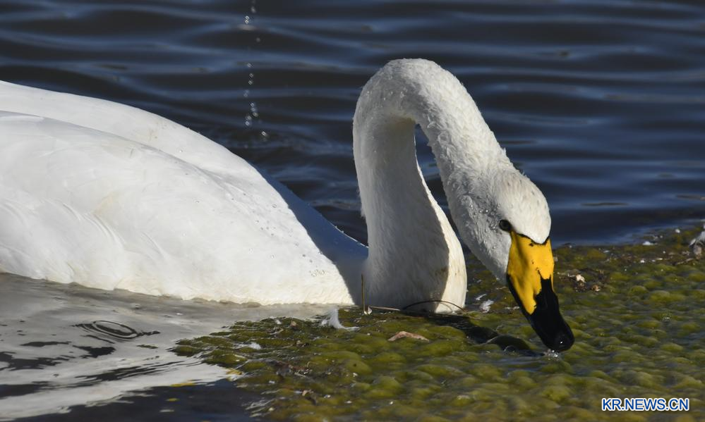 20일 한 백조가 베이징 미윈(密雲)저수지 유역에 위치한 칭수이허(清水河)에서 먹이를 찾고 있다.