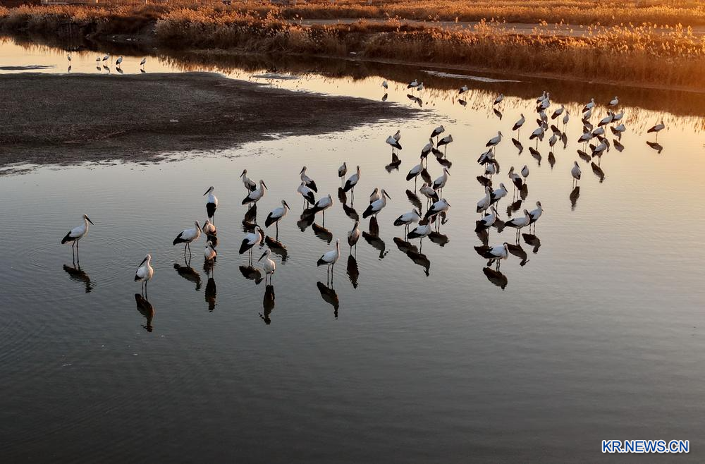 [신화망 스자좡 12월2일] 최근 허베이(河北)성 탕산(唐山)시 펑난(豐南)구의 연해 습지에 많은 황새가 먹이를 찾아 날아와 머무르면서 장관을 연출하고 있다.