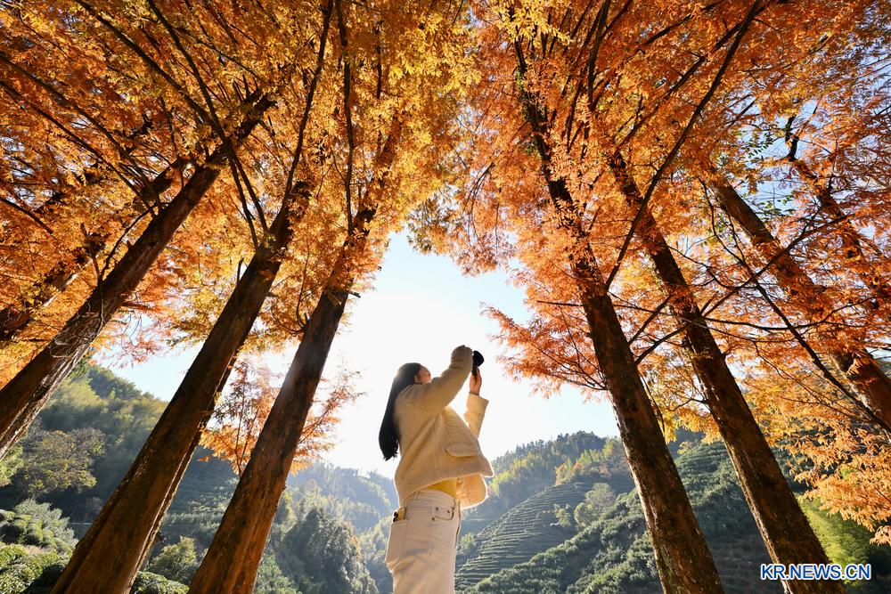 [신화망 우이산 12월3일] 1일 관광객이 푸젠(福建)성 우이(武夷)산 인근의 삼나무 숲 풍경을 촬영하고 있다.