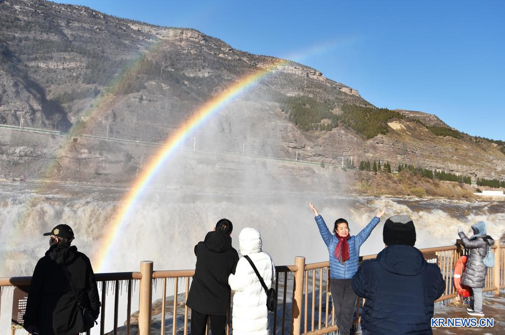 상류 저수지의 방류 작업으로 산시성 지현과 산시(陝西)성 이촨(宜川)현의 경계에 있는 황허 후커우 폭포에 수량이 증가했다. 물안개와 햇빛이 만나 생겨난 '쌍무지개'가 많은 관광객을 매료시켰다. 2025.12.3