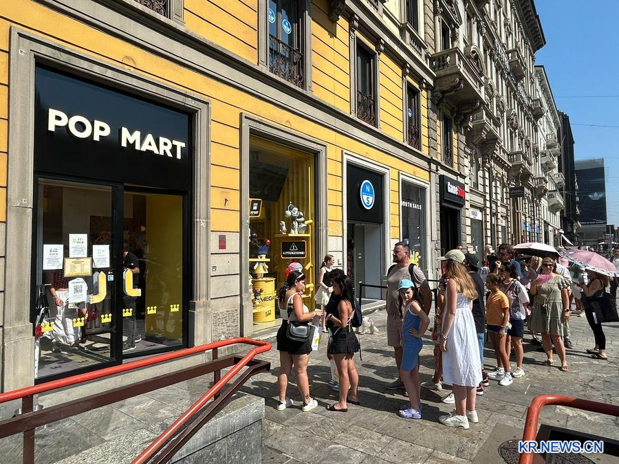 [신화망 파리 12월4일] 인파로 북적이는 프랑스 파리 루브르 박물관 지하 쇼핑몰. 입구 통로 한쪽에 자리한 국제 아트토이 브랜드 팝마트(POPMART·泡泡瑪特) 매장을 찾은 소비자들이 진열대에서 블라인드 박스를 고르고 있다.