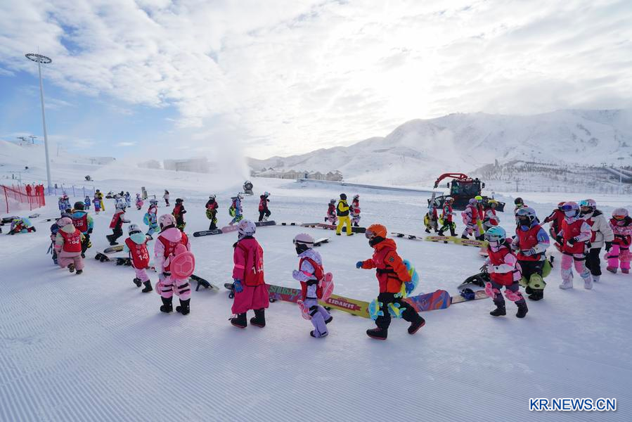지난 1일 신장(新疆)위구르자치구 아러타이(阿勒泰) 장쥔산(將軍山)국제스키리조트에서 학생들이 준비운동을 하고 있다. (사진/신화통신)