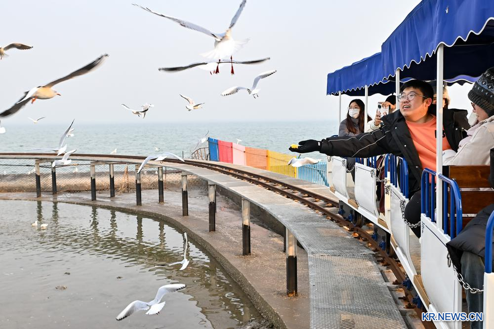 겨울철 톈진(天津)시 빈하이(濱海)신구의 하이베이(海貝)테마파크에는 갈매기가 무리지어 서식하고 있다. 이에 많은 관광객은 먹이를 주며 즐거운 시간을 보내고 있다. 2025.12.11