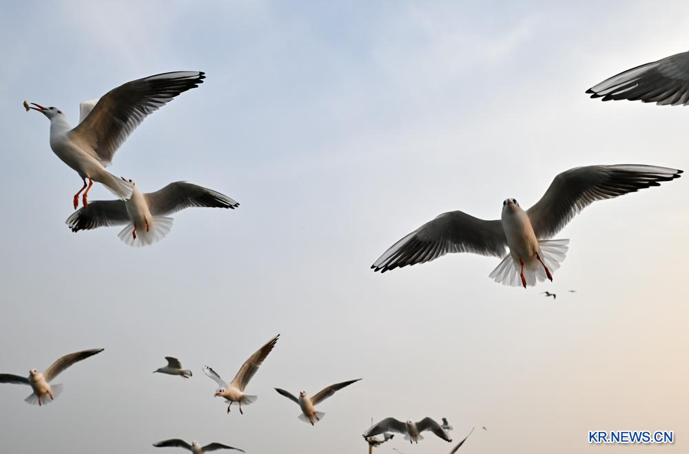[신화망 톈진 12월12일] 겨울철 톈진(天津)시 빈하이(濱海)신구의 하이베이(海貝)테마파크에는 갈매기가 무리지어 서식하고 있다. 이에 많은 관광객은 갈매기에게 먹이를 주며 즐거운 시간을 보내고 있다.