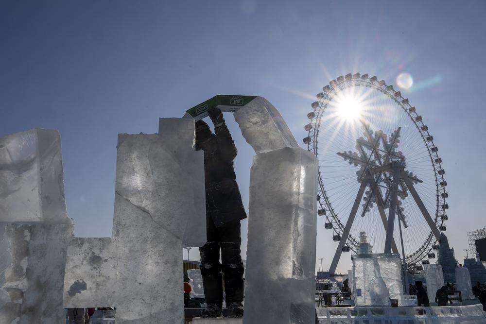 참가자가 2일 하얼빈(哈爾濱) 빙설대세계 단지에서 얼음 조각품을 제작하고 있다.