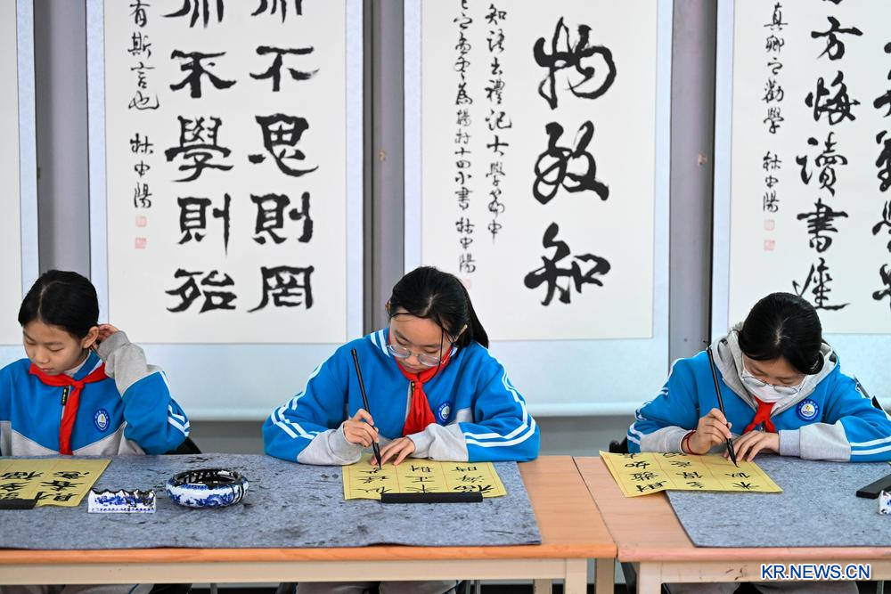 [신화망 톈진 1월7일] 6일 톈진(天津)시 우칭(武清)구 양춘(楊村)제14초등학교에서 서예 연습이 한창이다.