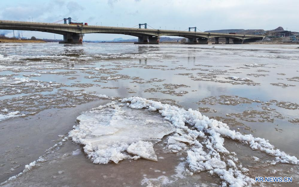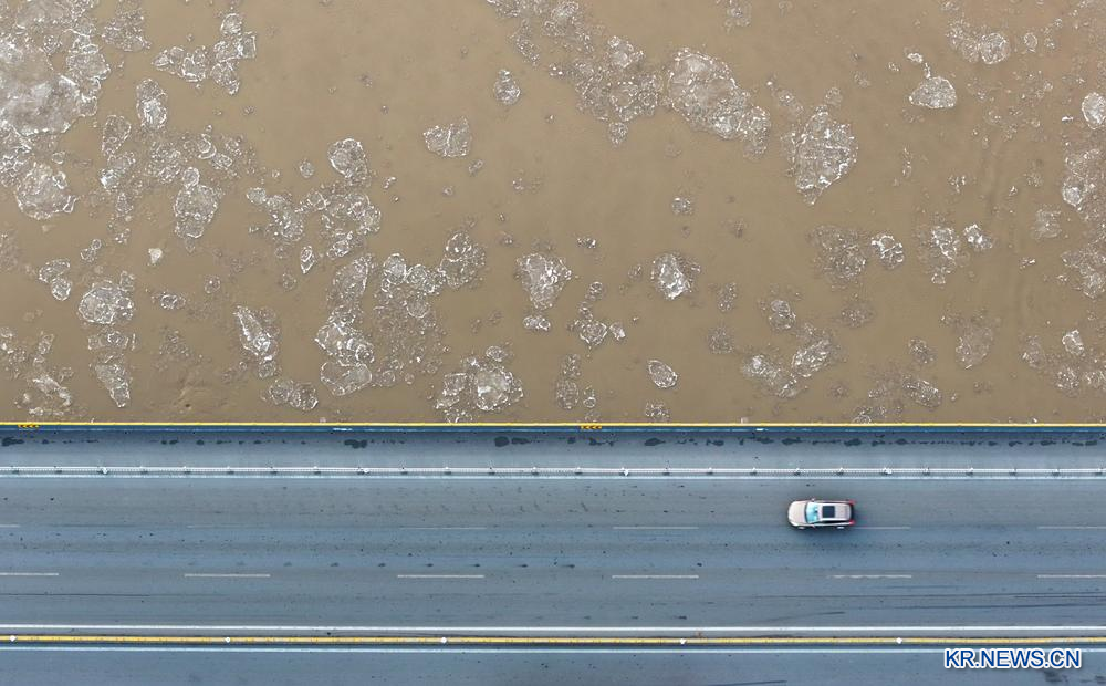 5일 닝샤(寧夏) 스쭈이산(石嘴山)시 후이눙(惠農)구에서 포착한 황허(黄河) 유빙.