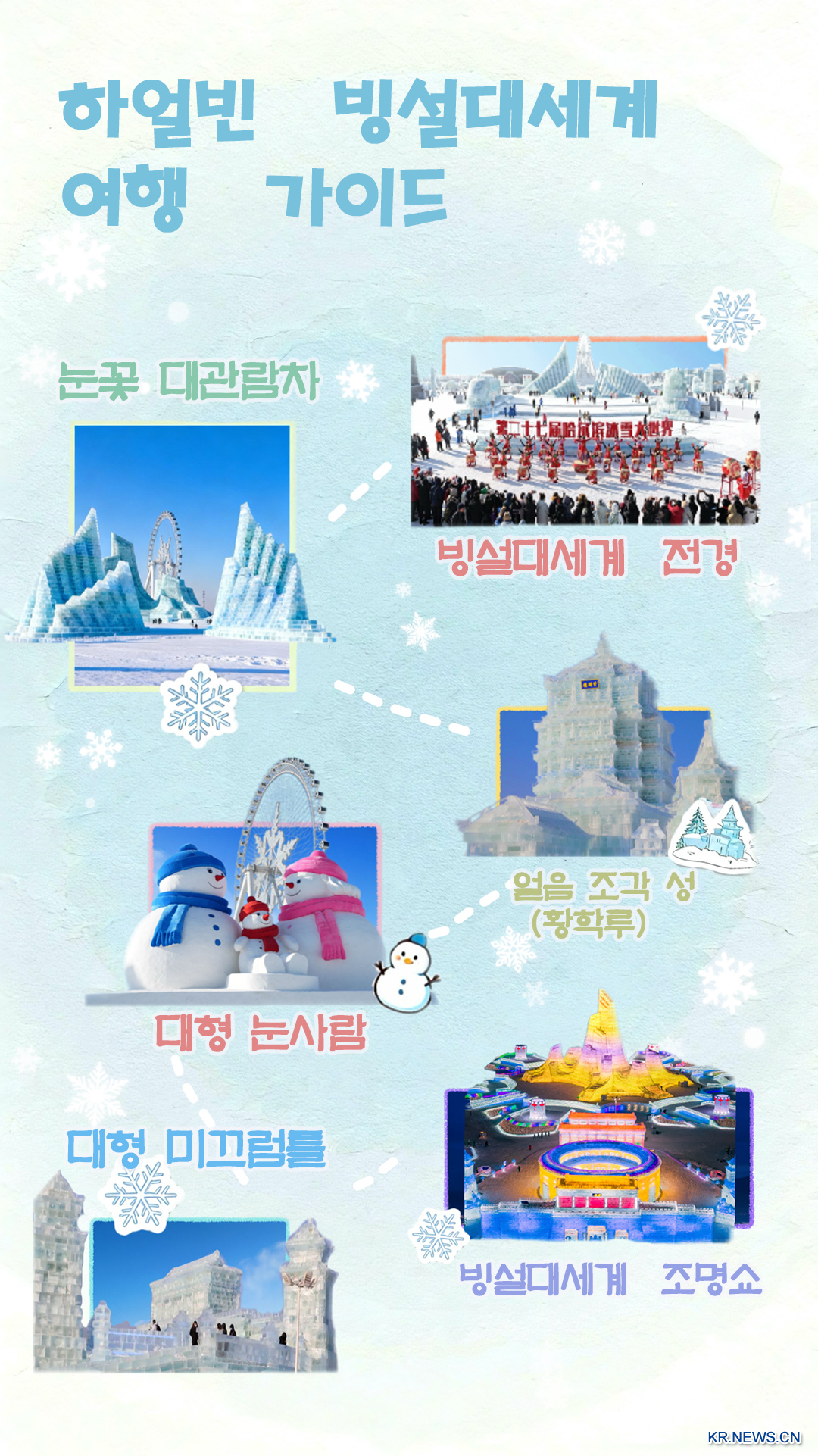 [신화망 베이징 1월22일] 중국 겨울철 최고의 랜드마크로 꼽히는 하얼빈 빙설대세계는 현실판 눈과 얼음의 왕국입니다. 낮에는 순백의 빙원을, 밤에는 반짝이는 불빛을 구경할 수 있을 뿐만 아니라 눈꽃 관람차와 초대형 얼음 미끄럼틀을 탈 수 있고 정교한 얼음 조각, 귀여운 눈사람과 인증샷도 찍을 수 있는 이곳은 하나하나가 놓칠 수 없는 겨울 추억을 선사합니다. 어떤 볼거리가 있는지 포스터를 확인해 보세요!