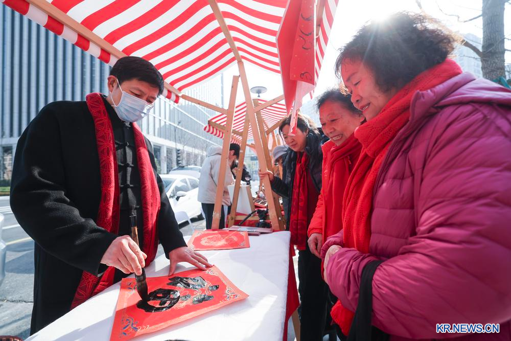 관광객들이 24일 저장(浙江)성 항저우(杭州) 무형문화유산 춘절맞이 용품 시장에서 복(福)자 장식품 증정 행사에 참여하고 있다.