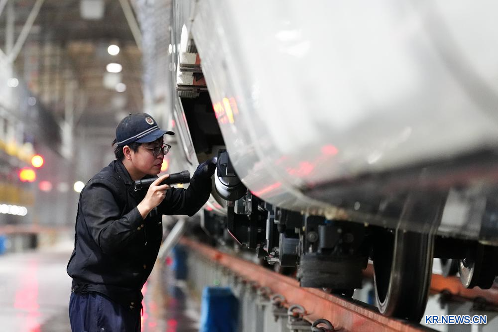 춘윈(春運·춘절 특별 수송)이 다가옴에 따라 시닝차량팀 및 관련 부서 직원들은 승객들의 안전한 여행을 위해 열차 점검과 유지·보수를 강화하고 있다. 2026.1.28