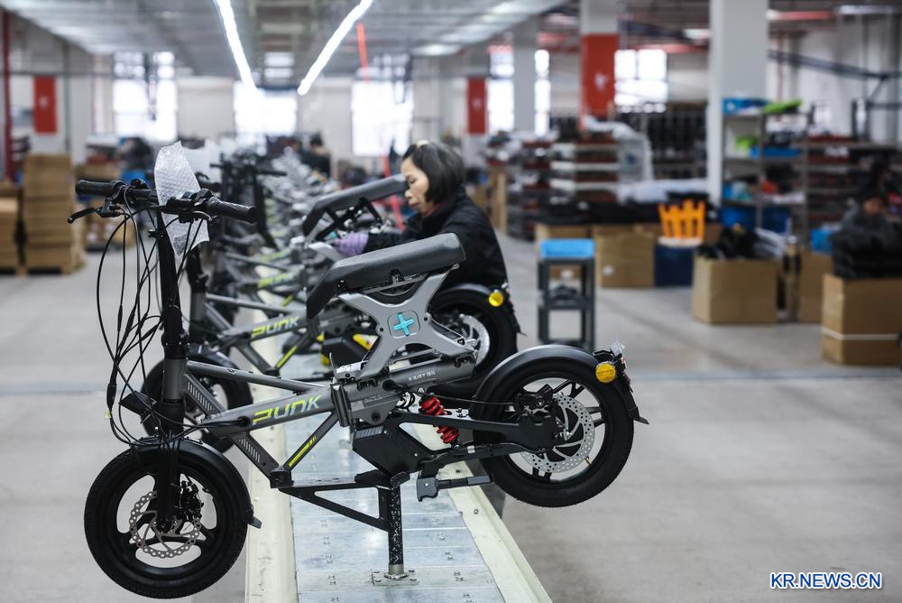 근로자들이 29일 저장(浙江)성 진화(金華)시 진둥(金東)구에 위치한 한 회사 작업장에서 접이식 전기 자전거를 조립하고 있다.