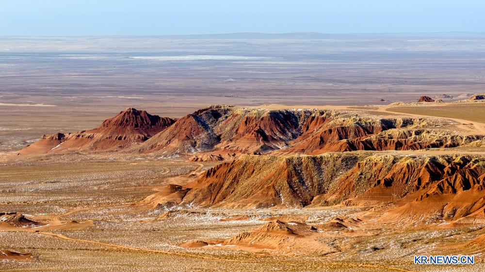 [신화망 중국 우란차부 1월30일] 29일 네이멍구(內蒙古)자치구 우란차부(烏蘭察布)시 쓰쯔왕(四子王)기에서 훙야(紅崖)대지(臺地)를 드론으로 담았다.