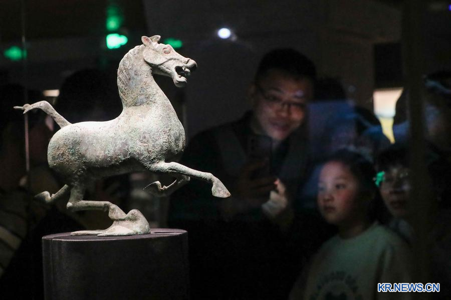 26일 밤 간쑤성 박물관 실크로드 문명전시실에서 동분마(복제품)를 관람하는 내방객. (사진/신화통신)