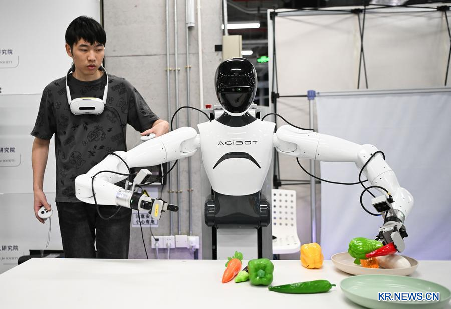 베이징 휴머노이드 데이터 훈련 센터에선 '콰푸' 로봇이 느리지만 그럴싸한 모습으로 옷 개는 동작을 반복해서 연습하고 있다.