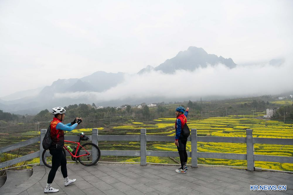 23일 자전거 애호가들이 안후이(安徽)성 쉬안청(宣城)시 지시(績溪)현에 위치한 유채꽃밭 인근 전망대에서 기념사진을 찍고 있다. 2026.3.24