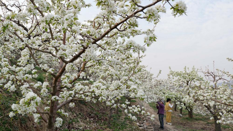 中 허베이성, 농번기 맞아 배꽃 솎기∙수분작업에 한창