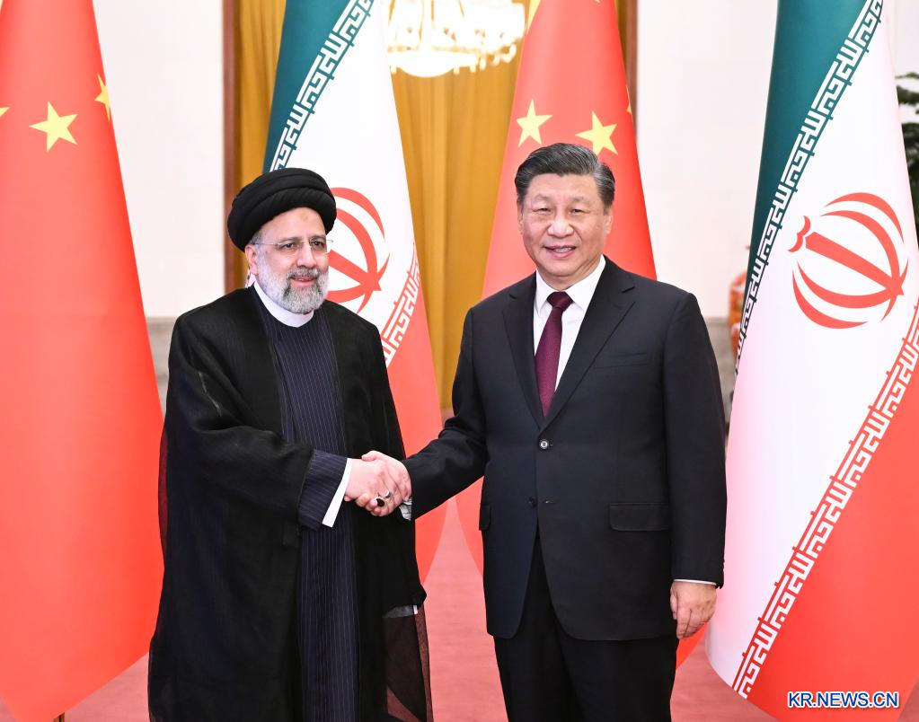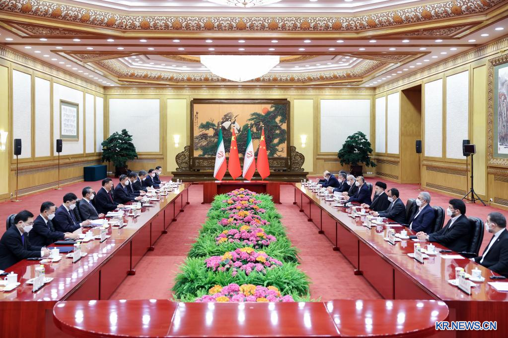 시진핑 국가주석이 14일 베이징 인민대회당에서 중국을 국빈 방문한 세예드 에브라힘 라이시 이란 대통령과 회담을 가졌다.[촬영/신화사 기자 류빈(劉彬)]