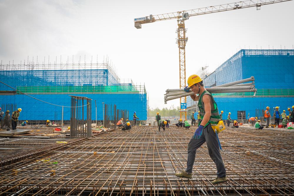 (중국 슝안신구=신화통신) 중젠(中建)3국 직원이 21일 슝안(雄安)과학혁신센터 2기, 3기 프로젝트 건설 현장에서 건축 자재를 옮기고 있다.
