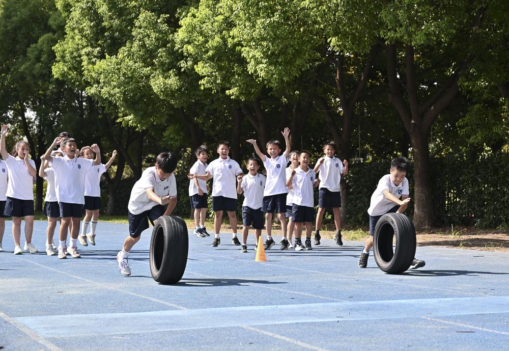 (중국 쿤산=신화통신) 장쑤(江蘇)성 쿤산(崑山)시 리런(禮仁)외국어학교 학생들이 14일 타이어 굴리기를 하고 있다.