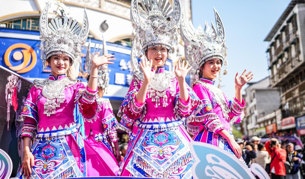 (중국 첸둥난=신화통신) 10일 화려한 의상을 갖춰 입은 먀오(苗)족 주민들이 손을 흔들어 인사하고 있다.