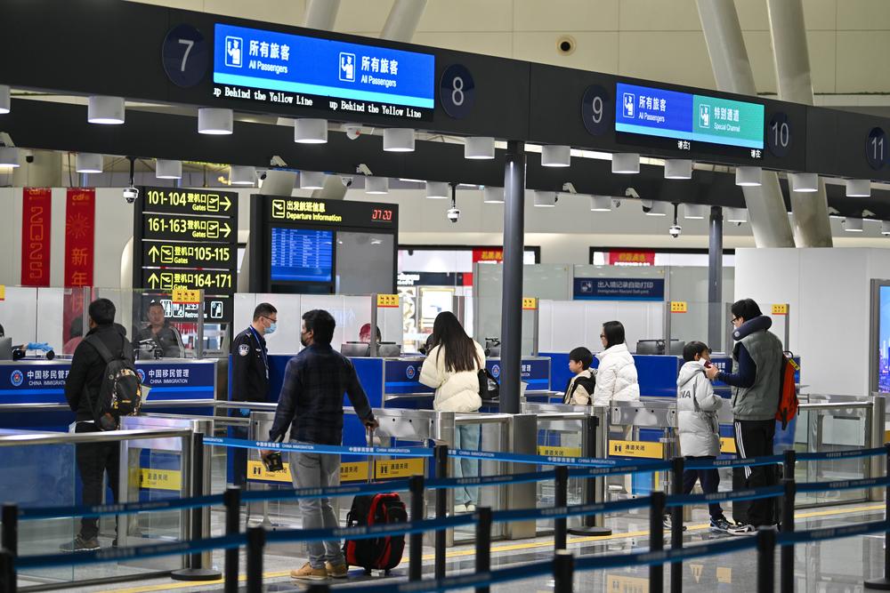 이날 빈하이국제공항 T1 터미널에서 출경 심사를 기다리고 있는 승객. 2025.1.16