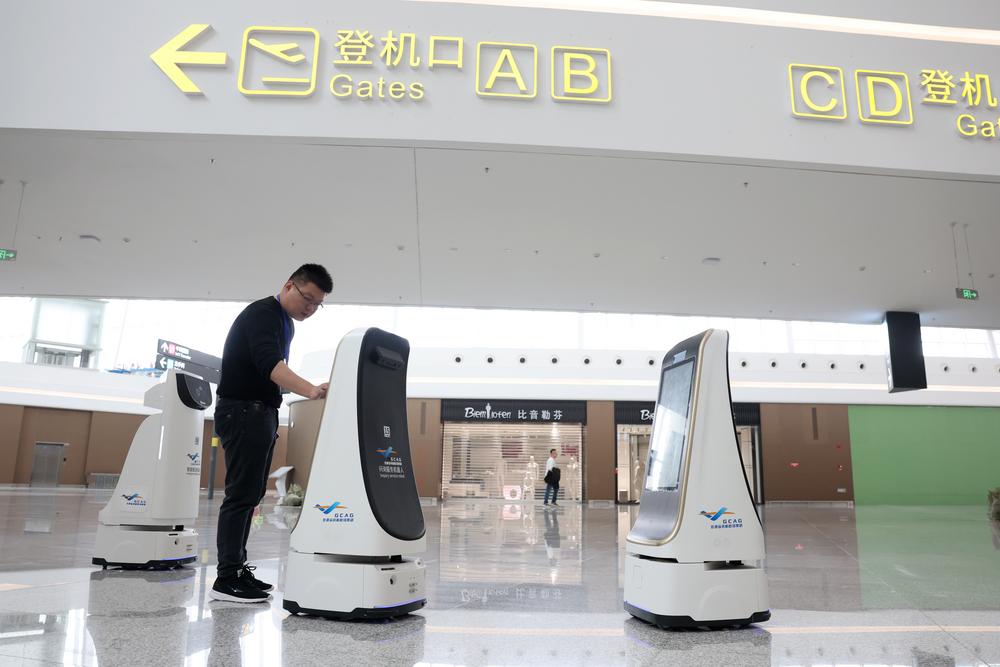 (중국 란저우=신화통신) 한 엔지니어가 11일 란저우(蘭州) 중촨(中川)국제공항 제3터미널(T3)에서 안내 로봇을 테스트 중이다.