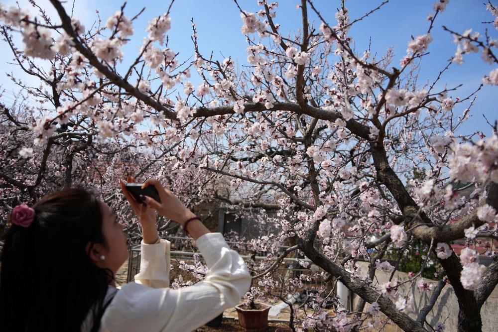 와이위촌의 대규모 살구밭이 개화 시즌을 맞자 관광객들의 발걸음이 줄을 잇고 있다. 2025.3.26