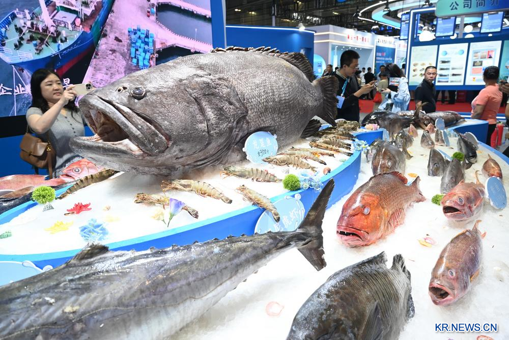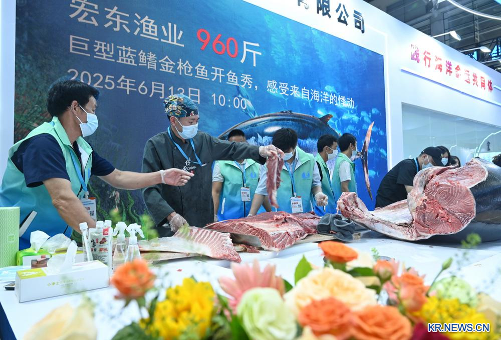'제17회 중국(푸저우) 국제어업박람회'가 13일 푸저우 하이샤(海峽)국제컨벤션센터에서 개막했다. 현장에는 식자재 구역을 비롯해 수산물 가공, 원양 어업 등 다양한 전시구역이 마련됐다. 이번 국제어업박람회는 오는 15일까지 열린다. 2025.6.13
